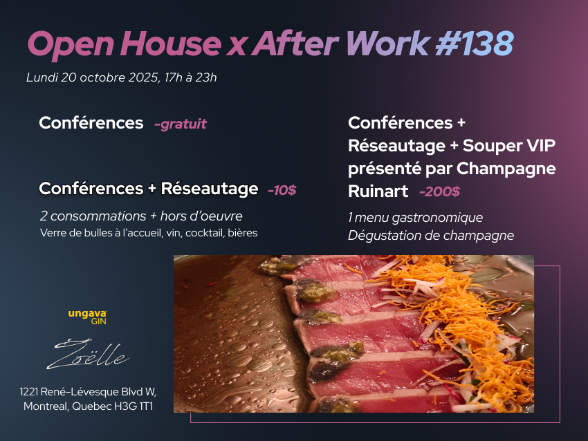 C’est avec honneur que notre événement After Work s’y associe pour célébrer sa 139e édition au restaurant Zoelle, en plein cœur de Montréal.