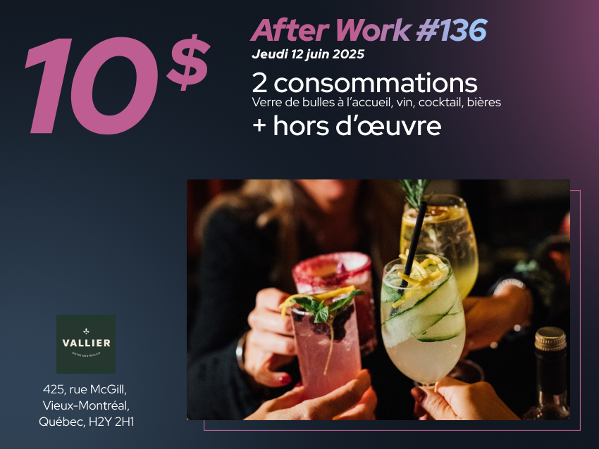 Nos événements After Work poursuivent leur lancée en 2025 avec cette 136e édition au bistro VALLIER. Niché au cœur du Vieux-Montréal, VALLIER combine l’élégance de la cuisine française, la chaleur d’un pub britannique et le côté vibrant de Brooklyn. Tout pour satisfaire vos papilles en bonne compagnie.