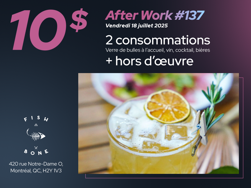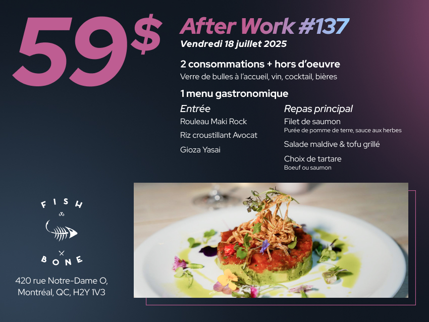 Nos événements After Work reviennent en force et pour cette 137ième édition nous sommes heureux de vous faire découvrir le restaurant Fish Bone. Situé dans le Vieux-Port de Montréal, le restaurant Fish Bone vous invite à découvrir une cuisine unique aux influences internationales, avec une touche d'inspiration asiatique qui plaira au convive moderne. Voir le menu